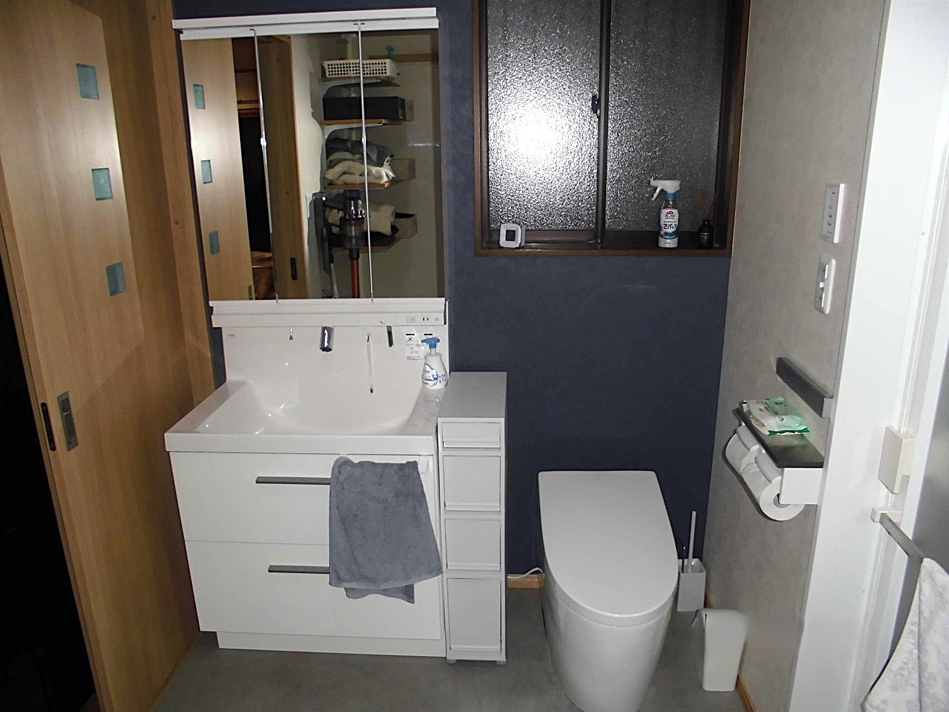 そこで今回のリノベーションでは、トイレの位置を見直し、洗面室・脱衣室と一体化することで、回遊性のあるサニタリールームへと間取りを変更。移動距離を短縮し、家事効率・生活動線の両面で大きな改善を図っています。洗濯、入浴、身支度といった日常動作が一連の流れで完結するため、忙しいご家庭でもストレスの少ない空間となりました。