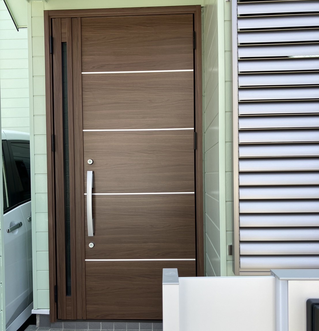 玄関ドアは防犯性能と断熱性を兼ね備えた新型へ交換。さらに古っくなっていた門柱は撤去し、新たに機能門柱を設置しました。見た目も機能もアップグレードした外観の仕上がりです
